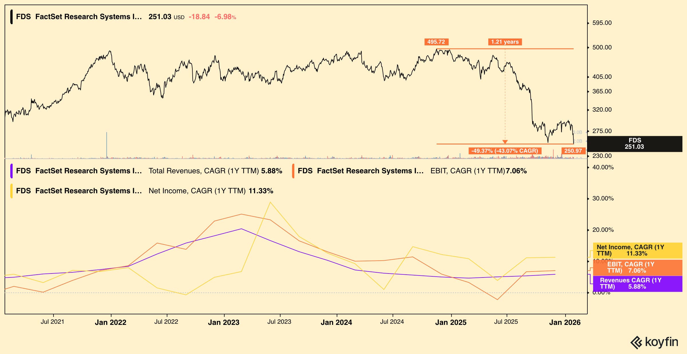 FactSet (FDS) is a high‑quality, wide‑moat financial data and analytics platform that has just gone through a brutal re‑rating. From a peak near $500, the stock has fallen 50%, compressing its multiple from a quality-at-any-price premium into not quite a GARP play, because growth is lacking, but more like a MARP (moat-at-a-reasonable-price) stock. Against that, the underlying business still exhibits classic compounder traits: sticky subscription revenue, mission‑critical workflows, high margins, and a long operating history.
