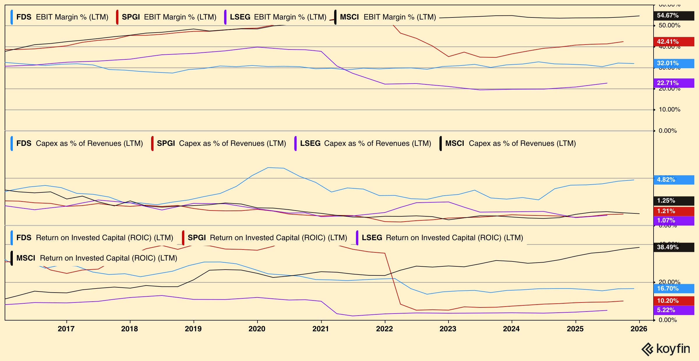 FactSet exhibits classic data/software economics – high margins, capital‑light, high ROIC.